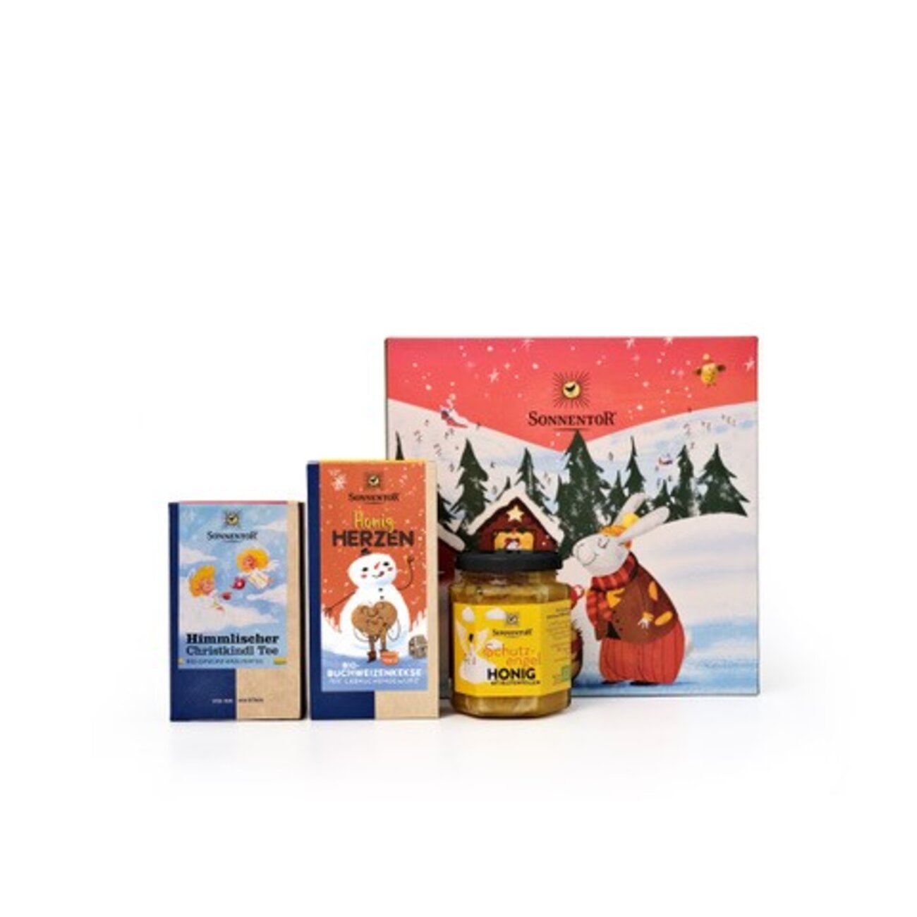 Inhalt je 1 Stück: Honigherzen Kekse glutenfrei bio, Packung, Himmlischer Christkindl Tee bio, Aufgussbeutel-Spenderkarton, Schutzengel® Honig bio. Zutaten, Allergene und Nährwerte der einzelnen Sorten findest du bei den einzelnen Produkten.