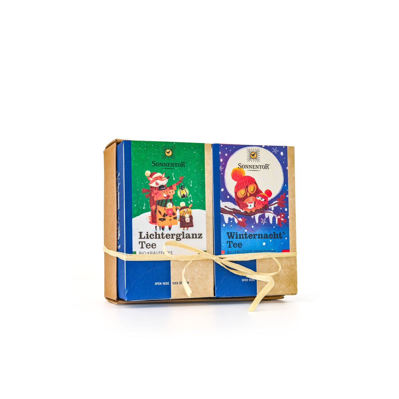 Inhalt je 1 Stück: Lichterglanz Kräutertee bio Aufgussbeutel-Spenderkarton, Winternacht® Früchtetee bio Aufgussbeutel-Spenderkarton. Zutaten, Allergene und Nährwerte der einzelnen Sorten findest du bei den einzelnen Produkten.