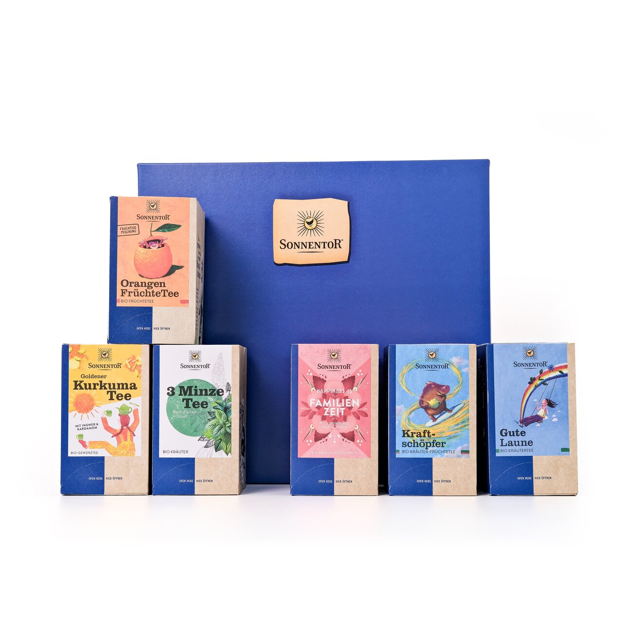 Inhalt je 1 Stück: Familienzeit Tee Happiness is® bio Aufgussbeutel-Spenderkarton, Goldener Kurkuma Tee bio Aufgussbeutel-Spenderkarton, Orangen Früchte Tee bio lose, Gute Laune Kräutertee bio Aufgussbeutel-Spenderkarton, 3-Minze Tee bio Aufgussbeutel-Spenderkarton, Kraftschöpfer Tee bio Aufgussbeutel-Spenderkarton. Zutaten, Allergene und Nährwerte der einzelnen Sorten findest du bei den einzelnen Produkten.