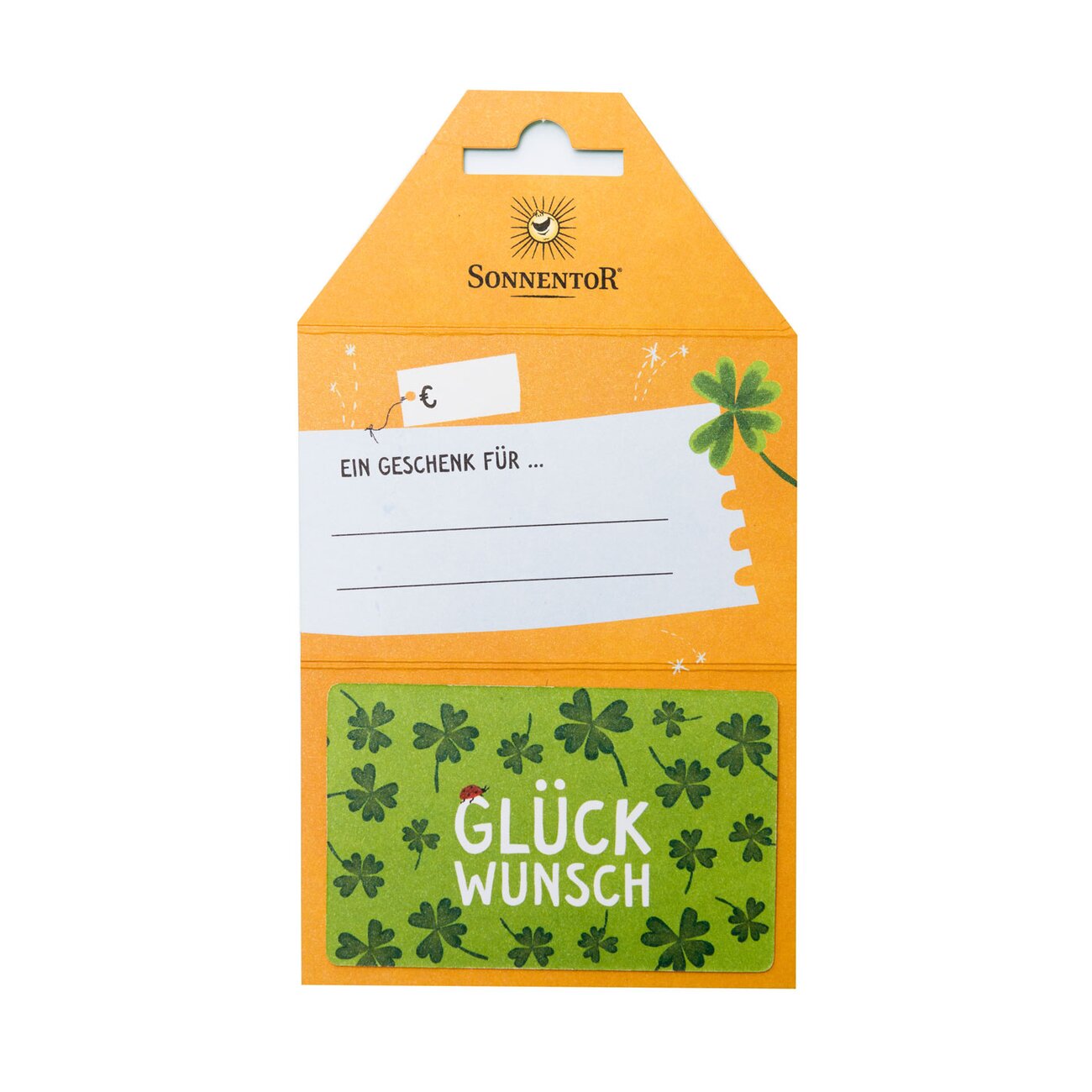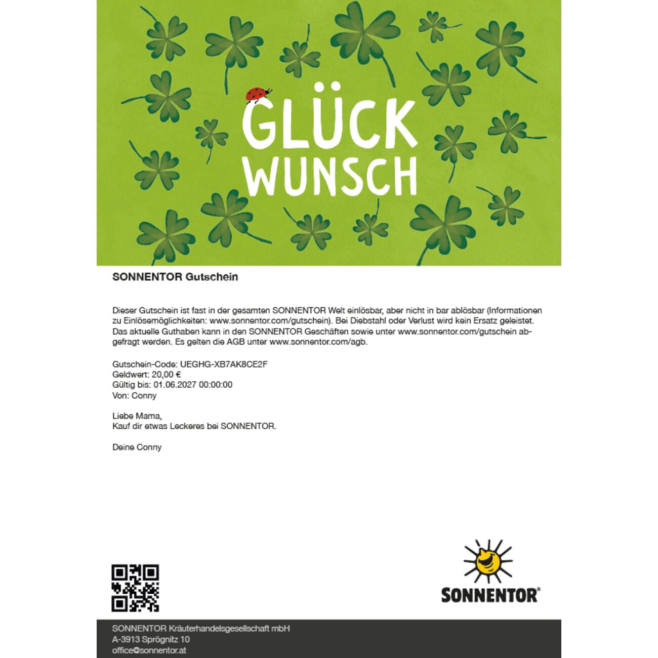 Mit dieser "Glückwunsch" Gutscheinkarte eröffnet sich dem Beschenkten (fast) die gesamte SONNENTOR Welt. *) Der Betrag ist frei wählbar (5€ bis 200€).
