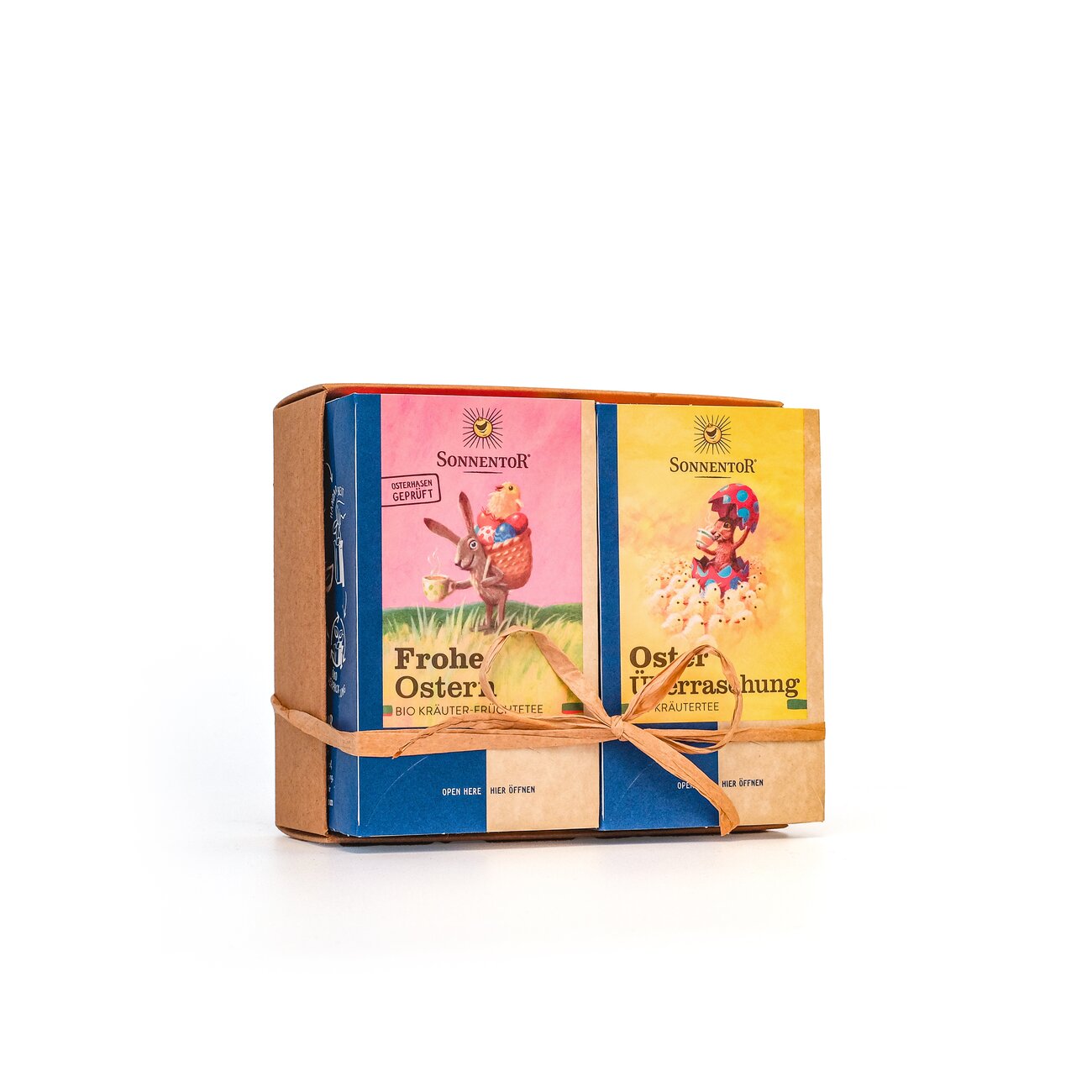 Inhalt je 1 Stück: Frohe Ostern Tee bio 27 g, Doppelkammerbeutel, Osterüberraschung Tee bio 27 g, Doppelkammerbeutel. Zutaten, Allergene und Nährwerte der einzelnen Sorten findest du bei den einzelnen Produkten.