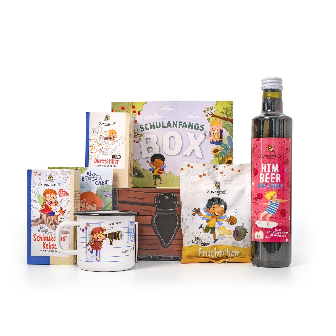 Inhalt: je 1 Stück Durststiller Früchte Tee Bio-Bengelchen® bio 32,4 g, Doppelkammerbeutel, Schlaukakao Kekse mit Kokosblütenzucker Bio-Bengelchen® bio 125 g, Packung, Früchtchen Bio-Bengelchen® bio 100 g, Packung, Himbeer Sirup bio 500 ml, Emaille Häferl Bio-Bengelchen;