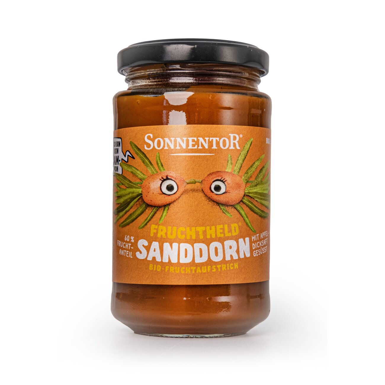 Wahre Helden lassen sich nicht von raffinierten Schurken einkochen, sondern nur mit Apfeldicksaft. Dank 60 % Fruchtanteil fällt dieser Aufstrich auf die Butterseite des Lebens. Und des Toasts. Der angenehm säuerliche Sanddorn harmoniert auch gut mit Joghurt und Topfen (Quark). Frühstück für Jampions!