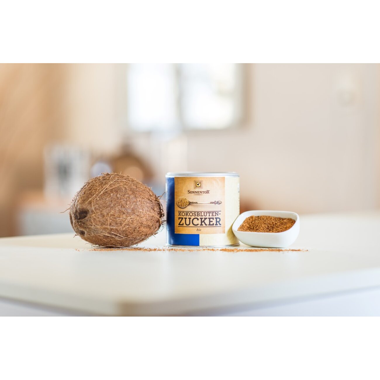 Kokosblütenzucker wird aus dem Blütennektar der Kokospalme gewonnen. Bauern klettern auf Kokospalmen um den Nektar in Gefäßen aufzufangen. Dieser wird dann in Kesseln über dem Feuer erhitzt bis er granuliert. Kokosblütenzucker zählt nicht nur zu den nachhaltigsten Zuckern sondern besticht auch durch seinen niedrigen Glykämischen Index und durch seinen einzigartigen karamelligen Geschmack.
