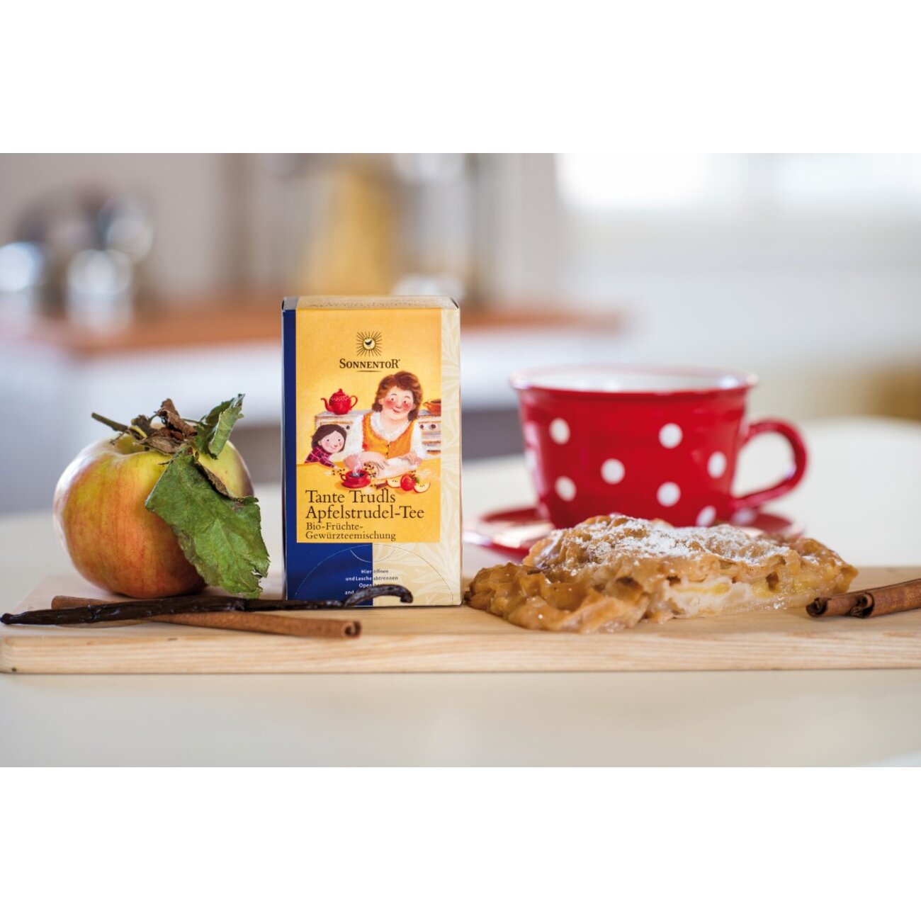 Die (beinahe) kalorienfreie Nachspeise ist eindeutig Tante Trudls Apfelstrudel Tee: egal ob man nicht backen will, auf Diät ist oder einfach nur guten Früchtetee genießen will, er ist die richtige Wahl.