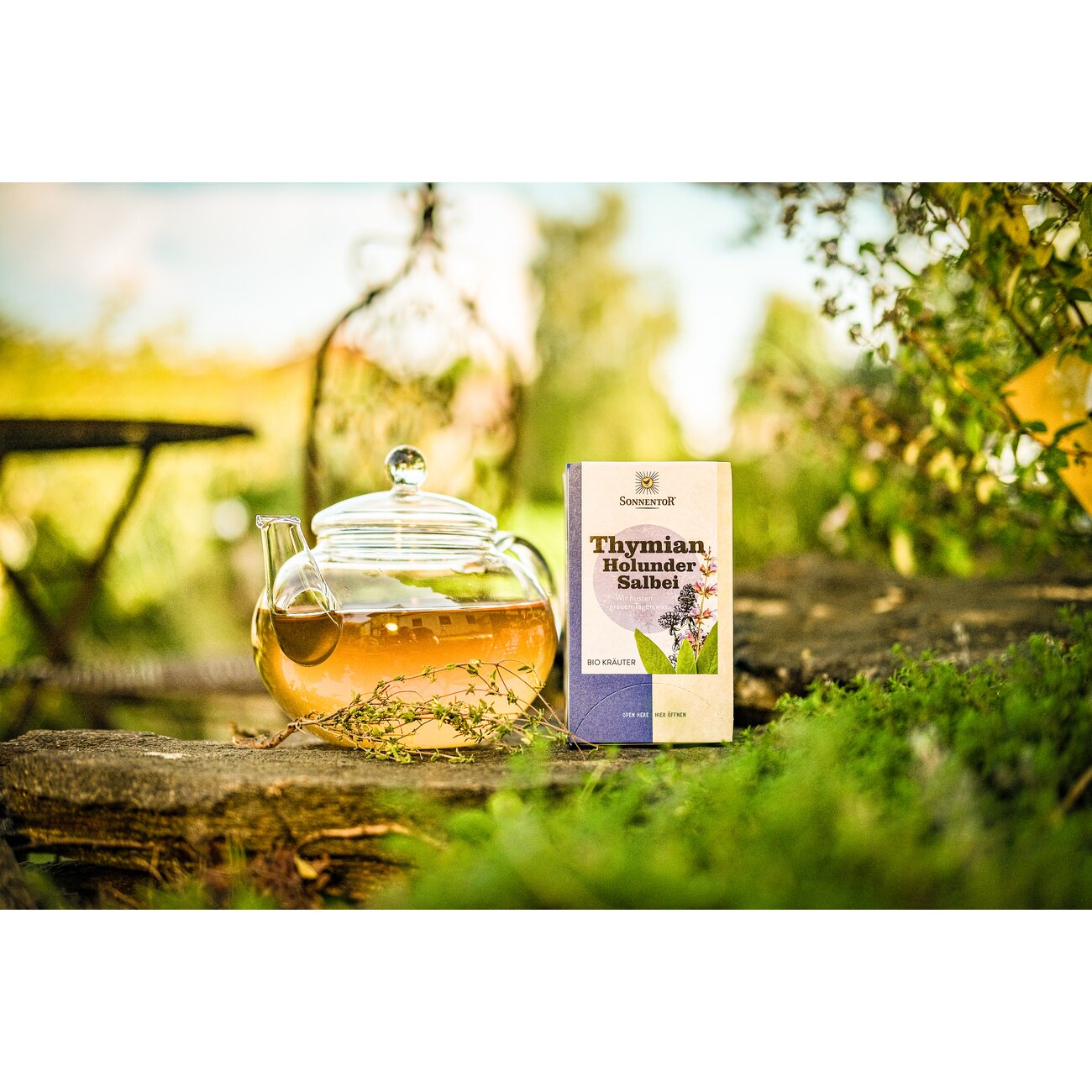 Speziell in der nasskalten Zeit sollte dieses Trio in jedem Teeschrank zu finden sein – wie früher bei Oma! Der Frosch im Hals sucht beim Anblick von Salbei freiwillig das Weite. Das Kraut wird schon seit dem Mittelalter für seine nützlichen Inhaltsstoffe hoch geschätzt – man vermutete, dass Menschen, in deren Garten Salbei wächst, ewig leben. Thymian sorgt mit seinem krautig-süßlichen Geschmack für wohlige Wärme, wenn es dich einmal fröstelt. Die blumig-süßlichen Holunderblüten geben der Mischung den letzten Schliff.