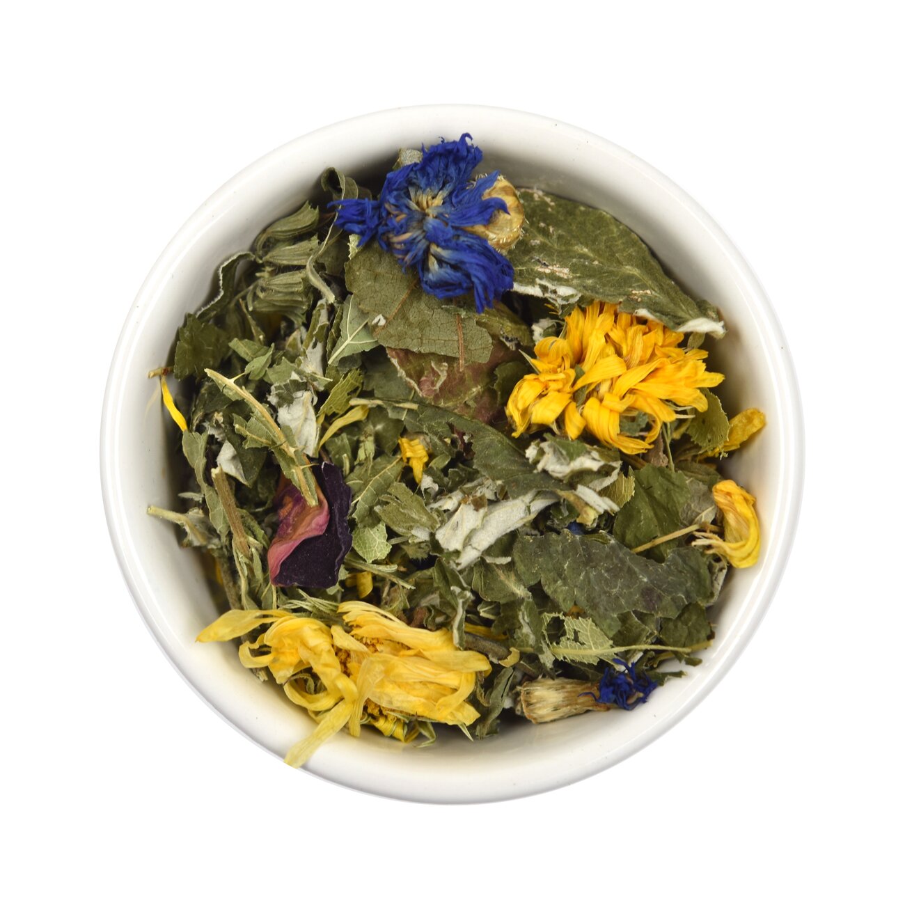 Lass dich inspirieren! Die Kraft der Kräuter ist fast magisch. Der Zaubertrunk schimmert in einem satten Goldgelb, hat er doch mit Zitronenmelisse, Lindenblüten, Rosmarin, Quendel und Rose den Sommer eingefangen. Er schmeckt würzig-blumig mit einer frischen, dezent herben Note und passt wunderbar zu Kuchen, Sorbets, Obst und Topfen. Die getrockneten Blätter werden von Hand abgepackt, so bleiben die ätherischen Öle möglichst gut erhalten. Hex-hex!