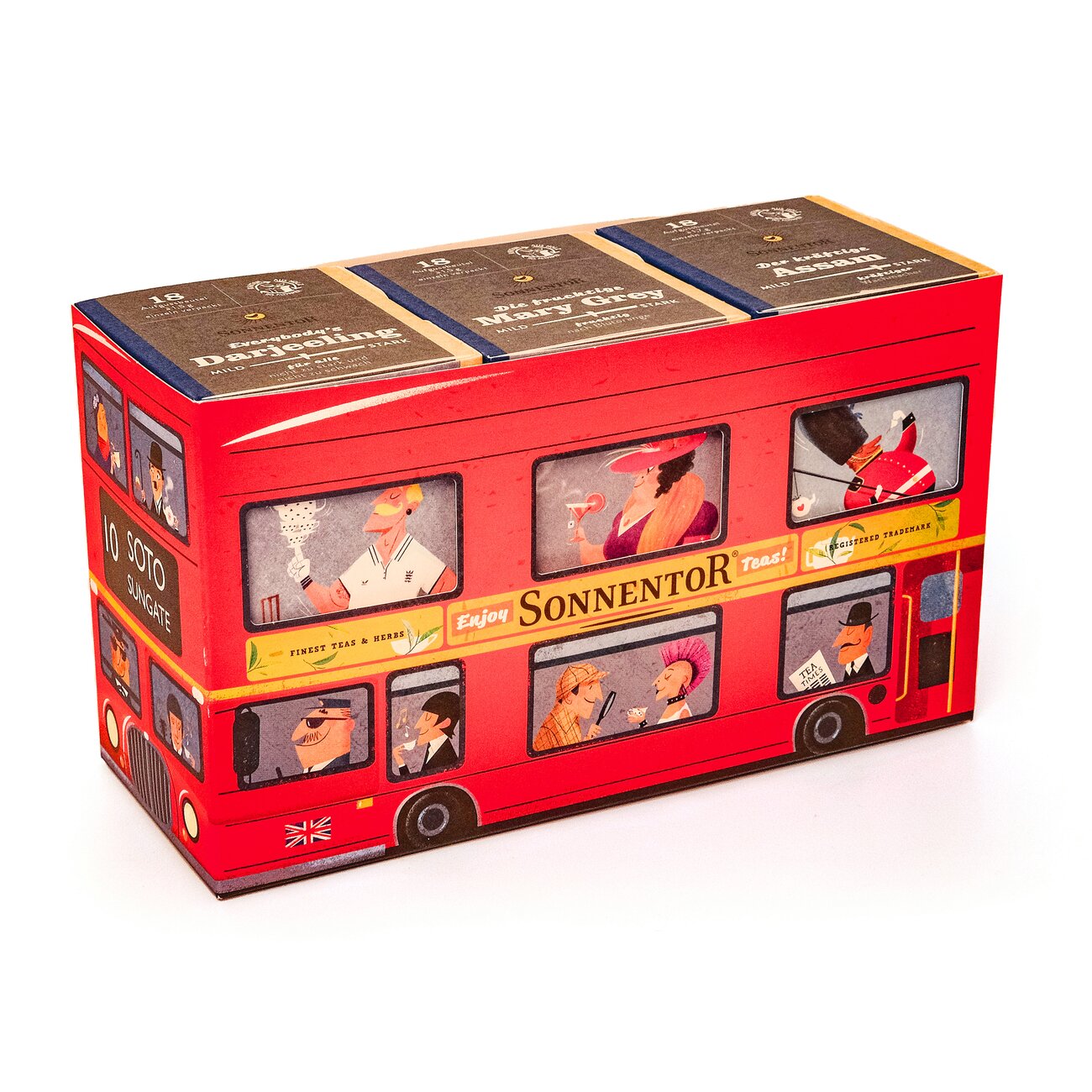 The London Bus is coming and everybody’s running… Dabei ist Rennen eigentlich nicht notwendig, denn der London Schwarztee Bus wartet gerne auf dich. An Bord hat er eine ganze Reihe illustrer Gäste unserer Tea Party die du unbedingt kennenlernen solltest: Die fruchtige Mary Grey, Everybody’s Darjeeling und Der kräftige Assam machen mit dir eine Tour zu drei wichtigen Haltestellen unserer Schwarztee-Linie. Gute Fahrt!
