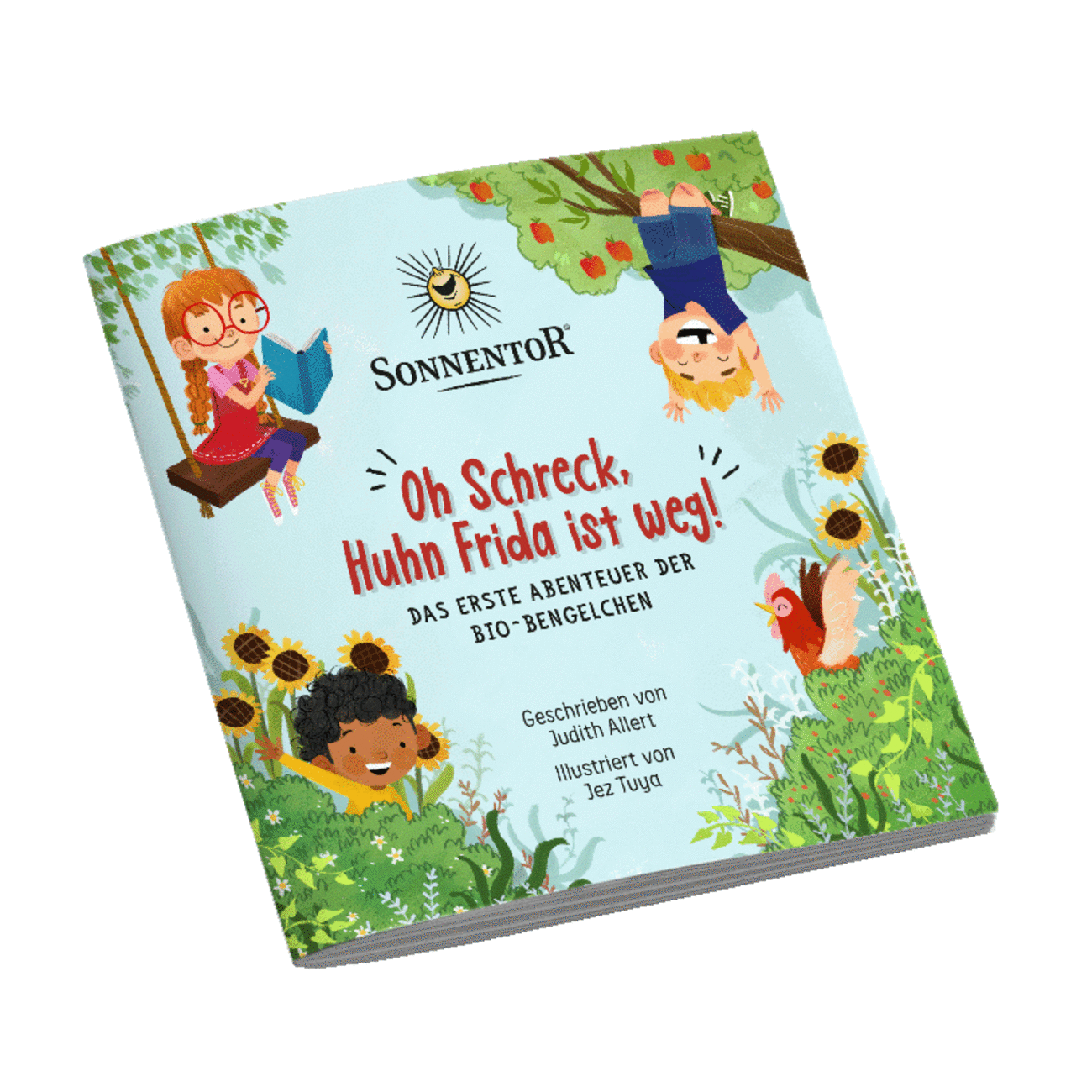 „Oh Schreck, Huhn Frida ist weg!“ Mit dieser Aufregung beginnt das erste Abenteuer der Bio-Bengelchen. Ob sie das Huhn finden und wie Constanze, Moritz und Leander dabei zu ihren Flügeln kommen, erfahren Bücherwürmer und Geschichten-Vorleser im Bio-Bengelchen Bilderbuch.