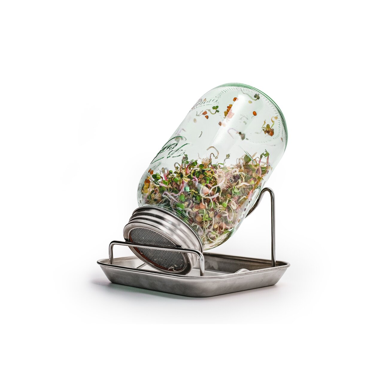 Einige unserer Sprossen aus gutem Hause genießen ihre Erziehung vorzugsweise im Sprossenglas. Das geht mit nur wenigen Handgriffen praktisch ohne jeden Aufwand: Die Samen werden nach Anleitung eingeweicht und anschließend regelmäßig gespült, bis sie munter sprießen. Überschüssiges Wasser fließt durch den Siebdeckel ab, wenn das Glas im mitgelieferten Ständer steht.