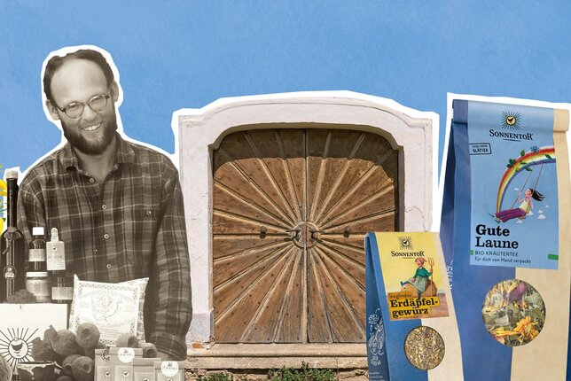 Wie alles begonnen hat? Mit unserem Hannes. Du erkennst ihn schon von weitem an der roten Brille, der Lederhose und an der guten Laune, die in überall hinbegleitet. Vor mehr als 30 Jahren hatte Hannes die Idee, die Produkte der Bäuerinnen und Bauern seiner Heimat zu verkaufen. Dafür schuf er den Namen SONNENTOR und das Bild der lachenden Sonne, dass du auf allen Packungen findest. Die SONNENTOR Sonne hat übrigens genau 24 Strahlen - das kannst du nachzählen. Bäuerinnen und Bauern schmückten ihr Tore gerne mit einer solchen Sonne, um ihre Freiheit und Unabhängigkeit zu zeigen.