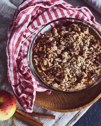 Auf dem Foto ist eine Form mit Apfel-Cranberry-Crumble zu sehen. Daneben liegen Zimtstangen und ein Apfel. | © SONNENTOR