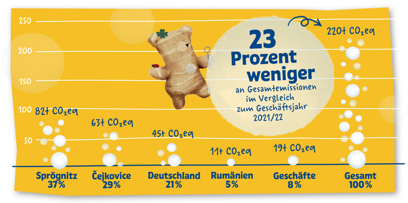 In den nächsten Jahren werden wir unseren CO2-Austoß nach und nach verkleinern, bis wir völlig emissionsfrei sind. Für jene Emissionen, die wir noch nicht vollständig verringern können, unterstützen wir Projekte, die selbst CO2 reduzieren bzw. durch den Aufbau von Humus langfristig im Boden binden. Der Fokus liegt aber auf der nachhaltigen Reduktion und Vermeidung von Emissionen. Du siehst: Ohne all diese Schritte sähe der Fußabdruck von unserem Herbquarter in Sprögnitz ganz anders aus.